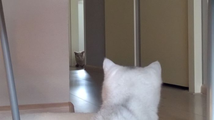 Hierboven zien jullie de eerste kennismaking van onze Ties met zijn toekomstige huisgenoot Indra! Zijn toekomstige pleegmoeder Femke stelt hem gerust. Ties kijkt zijn ogen uit en vond alles in het begin maar eng. Tieske gaat straks samenwonen met een katertje wat een maandje ouder is uit Zevenhuizen en zij zullen ook op precies dezelfde dag verhuizen. Dit katertje is geboren in de cattery waar de vader van Ties woont (Finn) en waar mamma Wiep destijds heeft gelogeerd. Dit eveneens Brits Korthaar katertje is na een verhuizing terug gekomen in zijn geboortehuis omdat het niet klikte tussen hem en een oudere Brit. Hij heet officieel Jerry maar Femke en Martin gaan hem straks Joep noemen. Joep heeft een point vachtje en wat erg fijn is, is dat Joep opgroeit met maar liefst 3 honden om zich heen in Zevenhuizen. Die 2 gaan straks samen in hun nieuwe thuis in Tiel lekker veel kattenkwaad uithalen en Joep kan onze Ties een beetje wegwijs maken en op sleeptouw nemen hoe om te gaan met een hond.