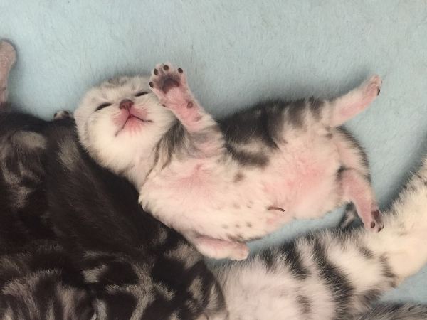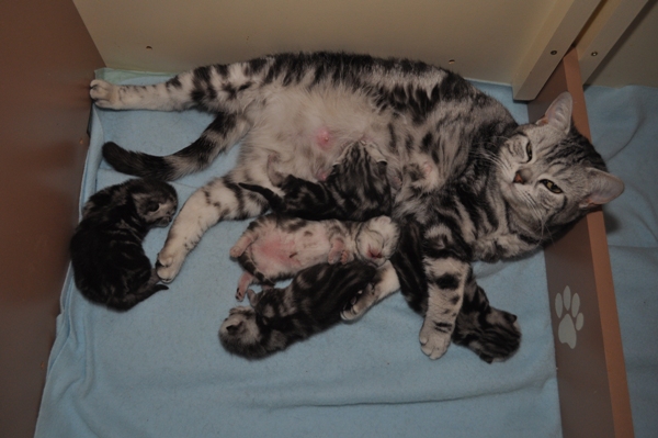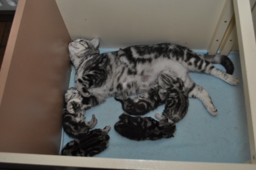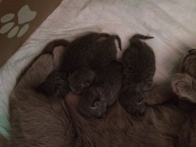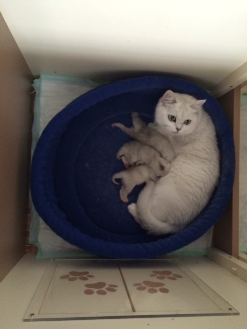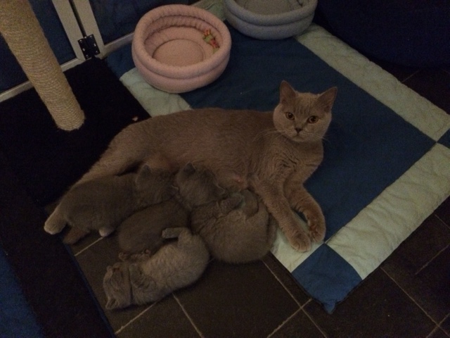En wat ging alles snel en goed, ondanks dat er zoveel tijd tussen haar 1e en 2e zwangerschap zat! Even na zevenen kreeg ze serieuze weeën die ze weg zuchtte en om 07:24 uur werd het eerste poesje geboren, weliswaar in een stuit maar Lailah deed het zo goed allemaal en kreeg het zelf goed voor elkaar. Het eerste moppie woog 92 gram. Lailah was metéén een volleerde mamma. Ze wist het nog allemaal! Wassen en het kleintje laten drinken, het ging van een leien dakje. Om 08:57 uur kwam een tweede kitten ter wereld, een katertje wat 102 gram woog en hij werd heel snel gevolgd om 09:25 uur door een tweede poesje wat heel klein was en maar 76 gram woog. Lailah nam een tijdje pauze en om 10:54 uur kwam een vierde kitten ter wereld, weer een poesje en dit keer de zwaarste van allemaal want zij woog maar liefst 114 gram. Alle kittens hebben de prachtige kleur blauw.
