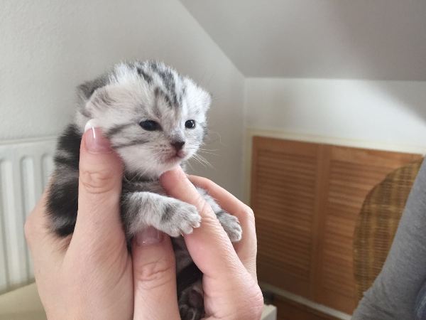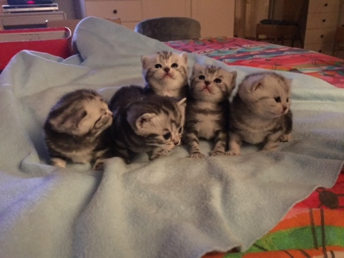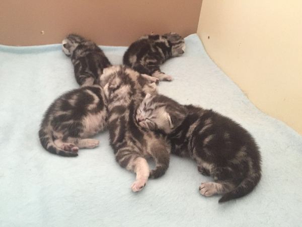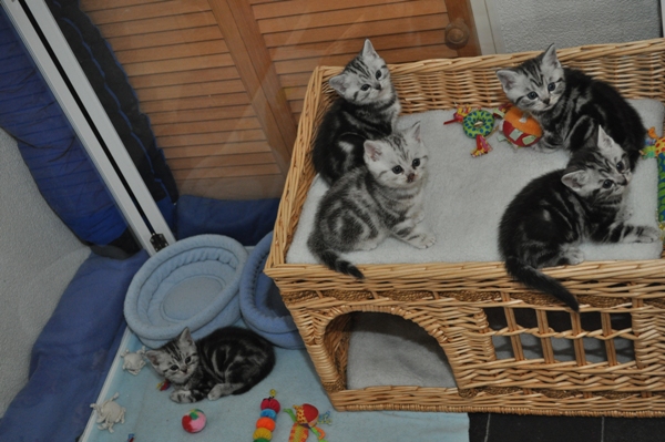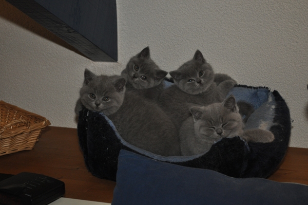 Twee poesjes en 2 katertjes. Poesje Cailynn was de grote verassing van dit nestje met haar ontplofte vacht: een Brits Langhaar! We krijgen dan altijd veel vragen hoe dat dan kan dat 2 kortharige ouders een langharige baby krijgen. Nou van Lily was al bekend dat ze het langhaargen draagt want haar mamma is immers de Brits Langhaar Inneke. Van Kenzo wisten Ron en ik niet dat hij het gen draagt maar dit was bij Karel en Ineke uit Den Bosch, waar Kenzo woont, zeker wel bekend. Wij hadden daar helemaal niet bij stil gestaan.