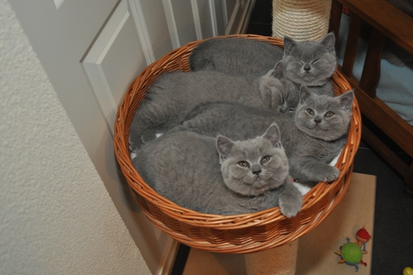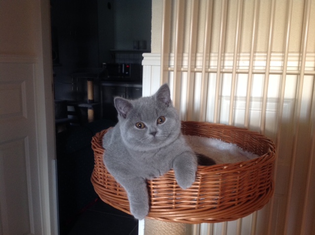 Lailah kreeg in 2013 haar eerste nestje: 2 blauwe dochtertjes (Vienna en Vitani) en 2 blauwe zonen (Vigo en Valerio) maar omdat Lailah zelf toen nog erg jong was besloten we pas uit een later nest een poesje zelf te houden. Lailah bleek bij zowel haar eerste als haar tweede zwangerschap erg moeizaam zwanger te worden. Dus hebben we besloten dit keer een blauw moppie zelf te adopteren zodat Lailah eventueel met vervroegd pensioen kan en dat is dus Annika geworden. Hieronder een leuke foto van onze Benjamin! (links in mandje kijkt zusje Avalon over het randje heen)