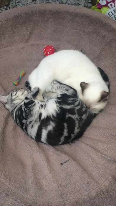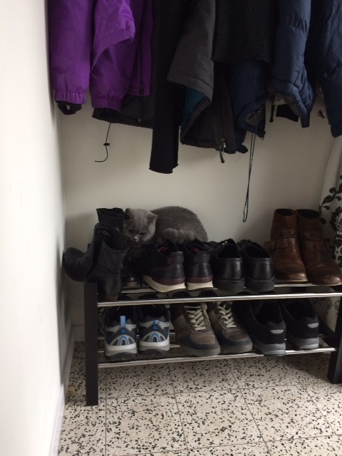 Op deze dag Ron en ik samen Ayla van Liesbrit naar Roosendaal gaan brengen. Ons mopje heeft heel de weg braaf liggen slapen. In haar nieuwe thuis was er even wat paniek en vond ze het schoenenrek in de hal een veilige plek om te schuilen. Nadat we haar daar even haar gang hebben laten gaan heb ik haar daar weg gehaald en op een krabpaal gezet zodat ze overzicht over haar nieuwe woonomgeving kreeg. Daar heeft ze lekker liggen dutten. Natuurlijk was het allemaal een tijdje wennen. Het is echt een mensenpoes en ze lag al snel bij haar nieuwe pleegouders op schoot. Maar ook omdat Finn, een iets jonger Brits Korthaar katertje, samen met haar die dag in hetzelfde huis is komen wonen, voelde Ayla zich al heel snel thuis.