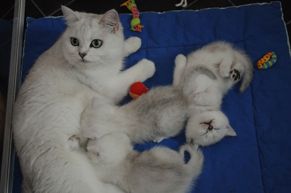Bijna 16 weken zijn de A-tjes nu. Ze oefenen al flink in de reismand en tevens drinken ze nog dagelijks bij hun zorgzame mamma zoals jullie hieronder kunnen zien. Op de laatste foto kun je ook nog eens duidelijk het verschil tussen de vachtkleur lilac en blauw zien.