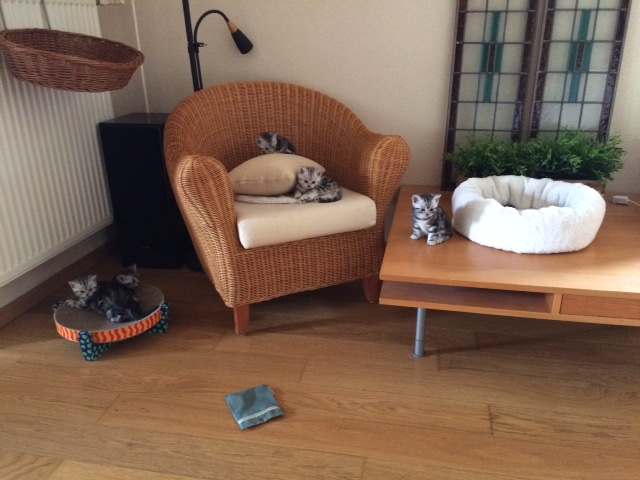 Misschien vragen jullie je nu af waarom ik in Godsnaam de kittens zo lang laat blijven en de verantwoordelijkheid van vakantie niet bij de pleegouders leg. Kittens die nog zo jong zijn kun je niet al binnen 3-4 weken na hun verhuizing naar een nieuw thuis al meteen 2-3 weken alleen in een huis laten met een of twee keer per dag verzorging van een lieve buur, familie of vriend. Daar zijn ze nog te jong voor. Wij stoppen al onze energie in het opvoeden van sociale katten en katten die sociaal zijn opgegroeid zijn vrijwel nooit lang alleen geweest. Dat kan natuurlijk wel wanneer een kat volwassen is, een geheel ander verhaal. Maar ook dan is het tijdens de vakantieperiode het beste wanneer er iemand in huis kan komen logeren waardoor de katten toch de hele dag door regelmatig mensen zien. Dus daarom blijven de kittens van Wiep langer bij ons. Al komt dit nu allemaal niet zo handig uit en hebben we dus zelfs ervoor moeten kiezen mamma Wiep even elders te laten logeren. Omdat van deze 5 kittens er maar liefst 2 koppeltjes gaan verhuizen kwam het dus net zo uit dat er dus niet één of hoogstens 2 kittens langer blijven maar dat ze alle 5 hier nog steeds wonen.