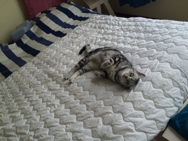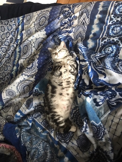 Rond een uur of half 6 kwam Lailah heel onrustig bij me liggen maar stond ze ook om de haverklap weer op een miauwde dan klaaglijk. Haar weeën waren duidelijk begonnen en ze zetten in een flink tempo door. De vliezen braken rond zeven uur. Zoals hieronder op de foto, op haar rug en geheel gestrekt, heeft ze een paar uurtjes naast me gelegen op bed en ze wilde het liefste dat ik steeds mijn hand op haar buik legde.