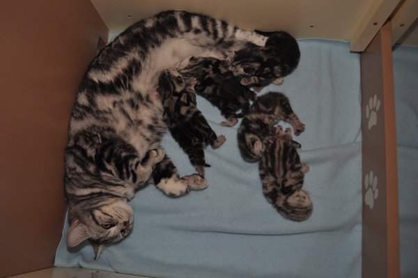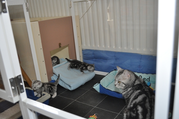 Bijna 1 week oud. Gelukkig gaat het met de 3 baby's heel erg goed. Ze groeien lekker door en mamma Lily is zoals vanouds weer een supermamma! Ze komt nauwelijks de kist uit, ze eet en drinkt er en verzorgd haar mini's vol overgave. Niemand, maar dan ook niemand mag het kamertje binnen lopen van de andere volwassen katten, zelfs Snoopy niet. Ze wil rust en het rijk alleen hebben en natuurlijk mag dat want de moederpoes in huis is áltijd de baas! Nou zijn onze volwassen Britten dit wel gewend, zij voelen dit feilloos aan dus de deur van de slaapkamer waar Lily en haar baby's is staat gewoon open. De vijf kittens van Wiep begrijpen zoiets op deze jonge leeftijd van 12 weken natuurlijk niet. Door hun onbevangen karakter en onbesuisde gedrag zouden zij zeker wél dit kamertje binnen lopen/rennen en nog veel meer... Dat zou de kersverse mamma Lily natuurlijk extreem onrustig maken en het enige wat de eerste maand telt is dat een moederpoes constant en in alle rust bij haar kindjes kan zijn zodat de melkproductie goed op gang komt en de baby's zo goed mogelijk kunnen groeien. De streepjespyjamaatjes en hun mamma verblijven voorlopig dus op de benedenverdieping. De kattendoorgang die we permanent in een muur hebben gemaakt en die vanaf de hal waar ook de trap naar boven is en in de woonkamer/keuken uitkomt is voorlopig op een gedegen wijze afgesloten.