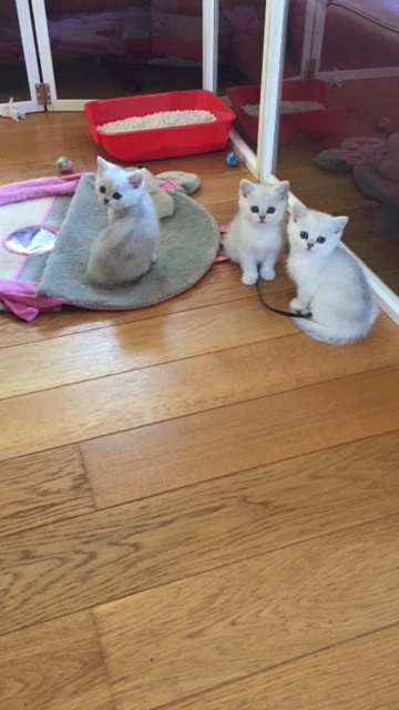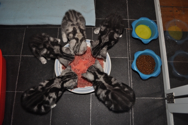 De mini's van Lily van ons Z-nestje zijn nu ruim 5 weken, waren onmiddellijk zindelijk toen ze in de huiskamer in de kittenren kennis maakten met het kattenbakje. Héle knappe kindjes heeft Lily altijd op dat gebied. Eten doen ze ook prima, maar wel alleen wanneer ik het ze voorschotel en ze telkens even met het mondje erin duw. Dan gaat de rest vanzelf. Maar uit zichzelf begrijpen ze dit onderdeel van het groter worden nog lang niet. De diverse bakjes met kittenbrokjes raken ze niet aan, ze willen alleen maar vers vlees en dat is prima voorlopig. Ze groeien goed maar lang niet zo hard op deze manier. Ze wegen nu alle 3 ruim boven de 500 gram. Maar wat een verschil met de kittens van Wiep die eigenlijk al rond de 4-5 weken de babycat brokjes helemaal uit eigener beweging begonnen te eten. Die wogen toen al met gemak 600-700 gram. Heel apart om de enorme verschillen in karakter steeds te zien tussen de diverse vachtkleuren. Al zijn het allemaal Brits Korthaar kittens, door de andere vachtkleur zijn er hele grote verschillen en dat merken we keer op keer. Precies dezelfde opvoeding en toch een geheel andere uitwerking. En natuurlijk zijn alle kittens lief en aanhankelijk. Maar de familie de Wit spant serieus de kroon op het vlak van lief zijn. Er bestaat niets lievers maar hebben zodoende ook een zeer zachtaardige aard waardoor ze vaak niet zo onverschrokken en dapper durven te zijn.