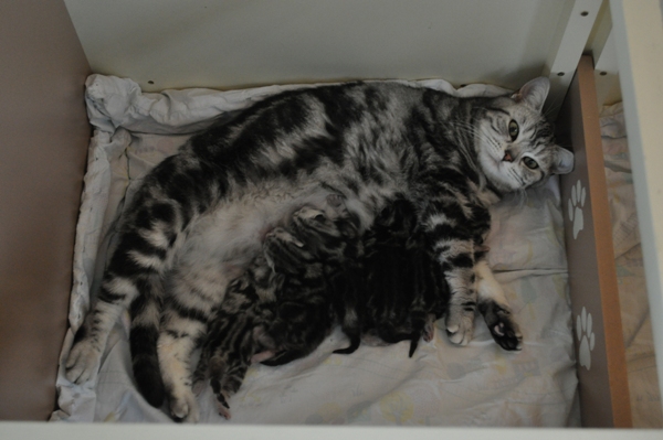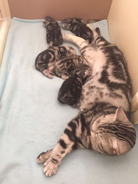 Altijd afwachten hoeveel baby´s ze dit keer mag krijgen. Na 2 keer 5 kittens verwacht je bijna dat het ook deze keer wel weer zo zal zijn maar de natuur is onvoorspelbaar dus we moeten rustig afwachten.