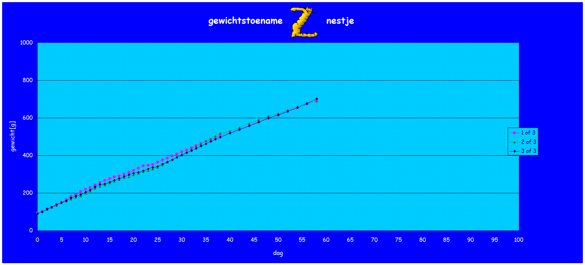 Charley (de rechtse hierboven die alleen in het blauwe mandje zit) werd als laatste geboren en dat was even een heftige bevalling voor Lily. Charley lag in een stuit en na best een lange tijd werd hij eindelijk geboren. Wel wat vruchtwater binnen gekregen dus alles uit de kast getrokken hem te helpen. De eerste uurtjes waren best zorgwekkend want hij piepte tijdens het ademhalen. Drinken bij mamma wilde/snapte hij ook niet. Drinken uit een flesje/spuitje ook niet. Ieder uur gaf ik hem puur suikerwater om hem alert te houden tot hij na een uurtje of 6 de smaak van de moedervervangende melk te pakken kreeg! Gelukkig!!! Ik heb die kleine schat 3 dagen lang om de 2 uur met een spuitje gevoed tot hij ineens zelf begon te drinken bij zijn mamma.