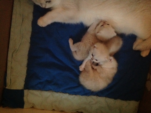 Vandaag was het inderdaad zover! Onze schat Lily is weer mamma geworden! Dag 65, Lily lijkt wel een uurwerk!! En Ron was er deze keer dus voor het eerst bij een bevalling van Lily. Het eerste kittens werd om 18:28 geboren en de tweede om 18:44 uur. Een katertje en een poesje. Beiden lagen in een stuit. Het derde baby'tje komt met het hoofdje eerst om 19:18 ter wereld en het is eveneens een poezenkind. Toen nam Lily even pauze. Na een hapje eten en wat lekker vers water kondigde nummertje 4 zich om 21:06 aan. Helaas heeft het als laatste geboren katertje maar een paar uurtjes mogen leven want hij kreeg snel na zijn geboorte plotseling ademhalingsproblemen. Ondanks dat Ron en ik letterlijk alles uit de kast hebben getrokken om hem erdoor heen te helpen mocht dat tot ons grote verdriet niet baten is hij heel vredig ingeslapen in onze armen... Gelukkig trekt een moederpoes zich daar totaal niets van aan. Ze keek nog niet op of om toen wij in alle hectiek bezig waren het leven van dit kereltje te redden. Zij lag volmaakt gelukkig met haar 3 witte sneeuwbolletjes in de warme bevallingkist te genieten van haar kroost!